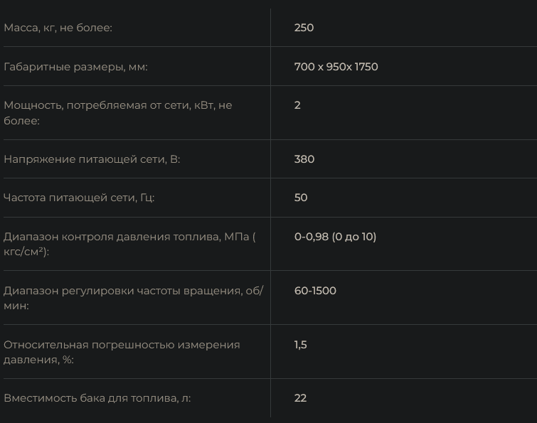 Назначение: стенд предназначен для испытания топливоподкачивающих насосов дизелей. Функциональные возможности: замер и контроль производительности топливоподкачивающего насоса; программное обеспечении стенда позволяет производить обработку и хранение информации о проведённых испытаниях; контроль и регулирование частоты вращения приводного вала; контроль температуры топлива в топливном баке; контроль и регулировка давления топлива; контроль и регулировка разряжения на всасывании.